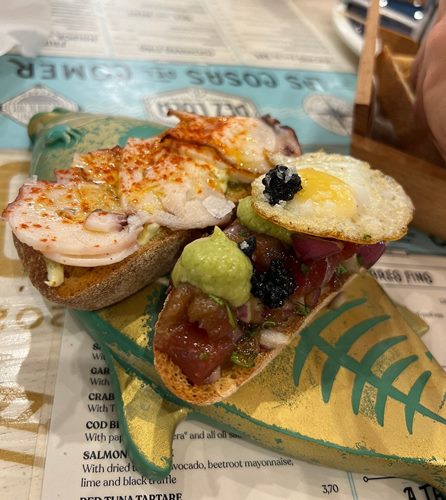 Highlights: Iberian Bikini, Prawns Skewer, Red Tuna Tartar, Cod Croquettes, Marinated Boquerones with Lemon, Chloe white, Tagus red, Abadía Retuerta red.